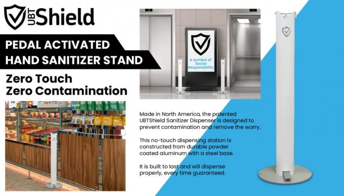 Made in North America, the patented UBTShield Sanitizer Dispenser is designed to prevent contamination and remove the worry. This no-touch dispensing station is constructed from durable powder-coated aluminum with a steel base. It is built to last and will dispense properly, every time guaranteed.